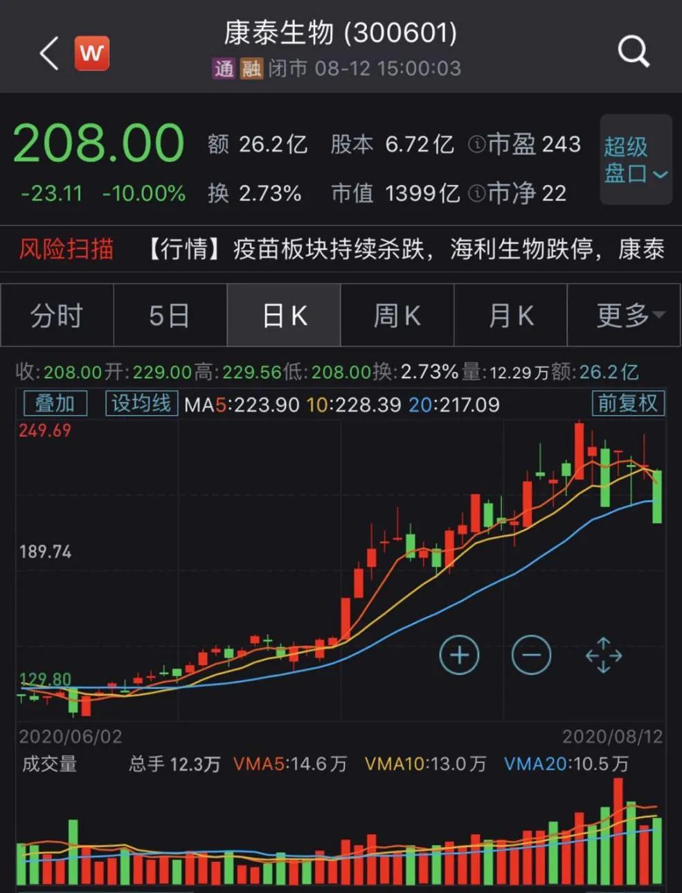 高位股集体杀跌。首先是疫苗板块,康泰生物跌停,西藏药业下跌9.87%,康华生物、万泰生物跌逾8%。