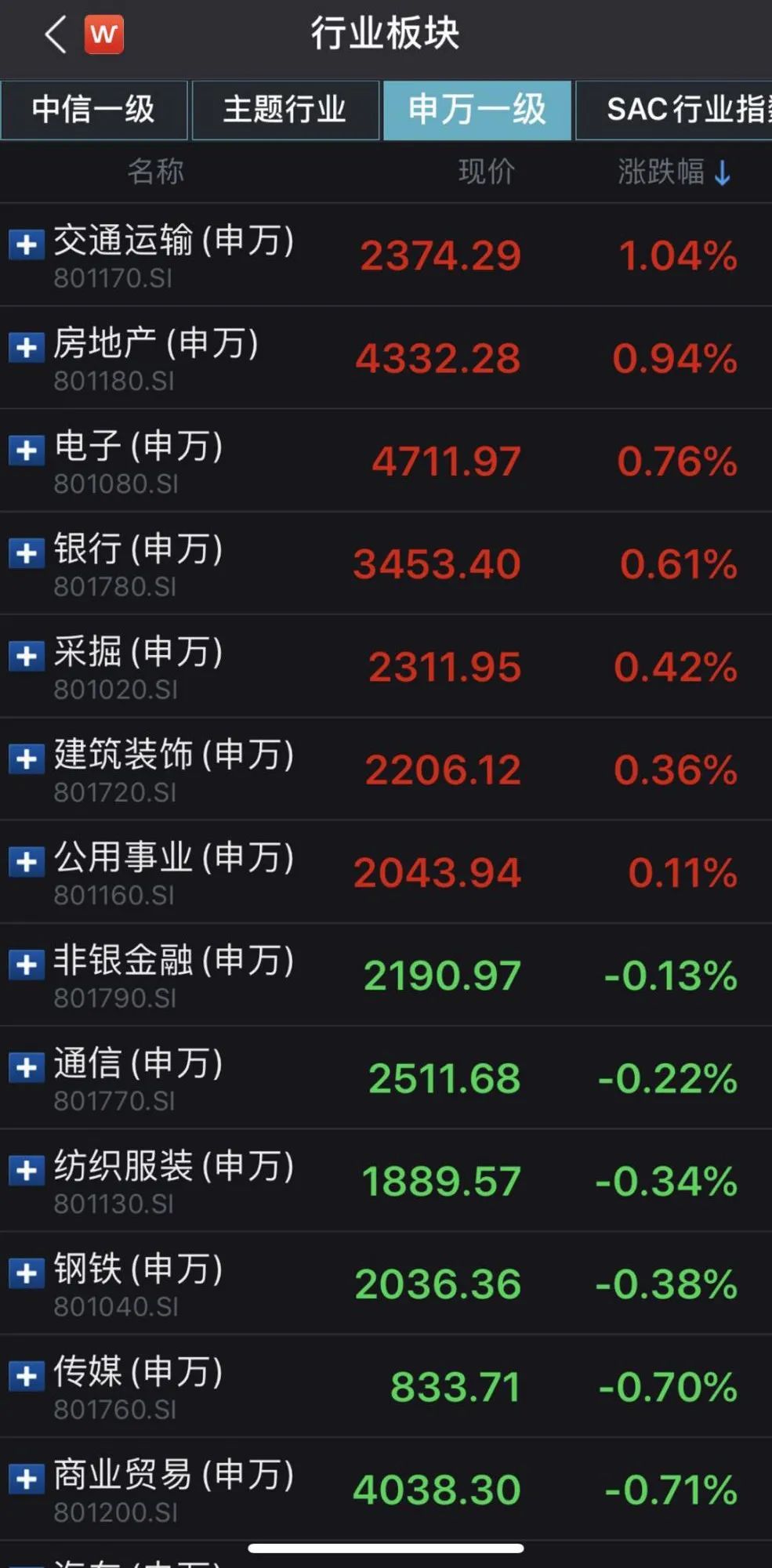 从盘面来看,申万28个一级行业中有7个行业板块上涨,交通运输、房地产、电子行业涨幅居前,分别上涨1.04%、0.94%、0.76%;在21个下跌的行业板块中,国防军工、医药生物、休闲服务行业跌幅居前,分别下跌4.96%、3.02%、3.00%。