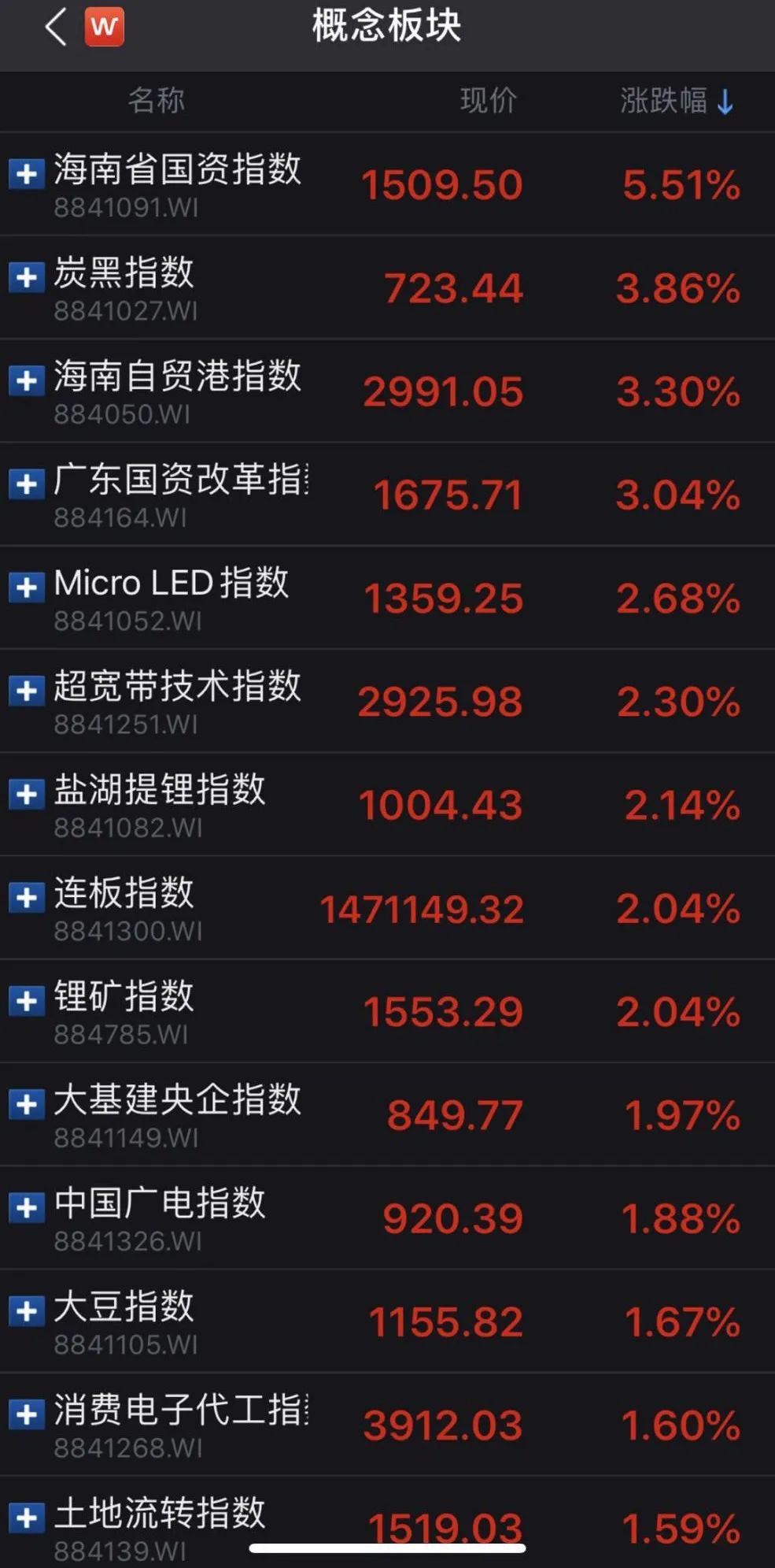 概念板块中,海南省国资、炭黑、Micro LED等板块涨幅居前,疫苗、生物制品、航母等板块跌幅居前。