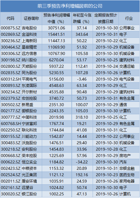 整体来看,已披露前三季度业绩预告的公司分化明显。净利润增速方面,预计前三季度归属于上市公司股东的净利润同比增长超过30%的公司有500多家,超过50%的有455家,超过100%的有280家,其中吉电股份、金溢科技、上海新阳、星徽精密与远方信息5家公司预计前三季度净利润同比增幅超100倍。