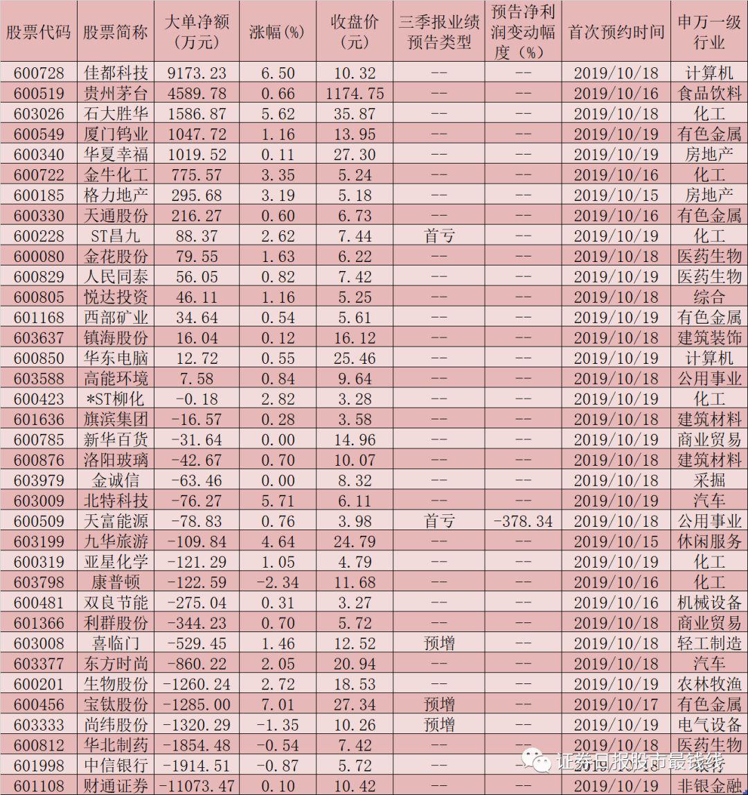 良好的市场表现离不开场内主流资金的追捧,9月27日,共有16只个股备受大单资金的青睐,合计吸金19045.70万元。具体来看,佳都科技(9173.23万元)、贵州茅台(4589.78万元)、石大胜华(1586.87万元)、厦门钨业(600549)(1047.72万元)和华夏幸福(600340)(1019.52万元)等个股当日均受到1000万元以上大单资金布局,金牛化工、格力地产、天通股份、ST昌九、金花股份(600080)、人民同泰(600829)、悦达投资(600805)、西部矿业(601168)、镇海股份(603637)、华东电脑(600850)、高能环境(603588)等个股9月27日也获得大单资金抢筹。