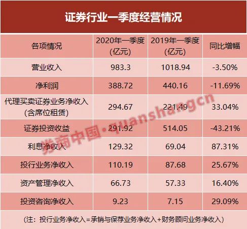 具体来看,一季度证券行业共实现代理买卖证券业务净收入(含席位租赁)294.67亿元,同比增33%;投行业务净收入110.19亿元(含证券承销与保荐业务净收入96.58亿元,财务顾问业务净收入13.61亿元),同比增25%;资产管理业务净收入66.73亿元,同比增16%;利息净收入129.32亿元,同比增87%;证券投资收益(含公允价值变动)291.92亿元,同比下滑43%。需要注意的是,以上均为未经审计数据。