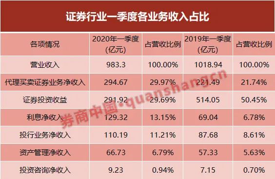 今年一季度,自营收入同比下滑43%,且占比下降至30%以内。由于A股波动性较大,从1月份的震荡下跌,2月份的“宅家牛”再到3月份受全球股市暴跌“波及”,机构投资者在权益市场操作难度加大,业绩不免“难看”。