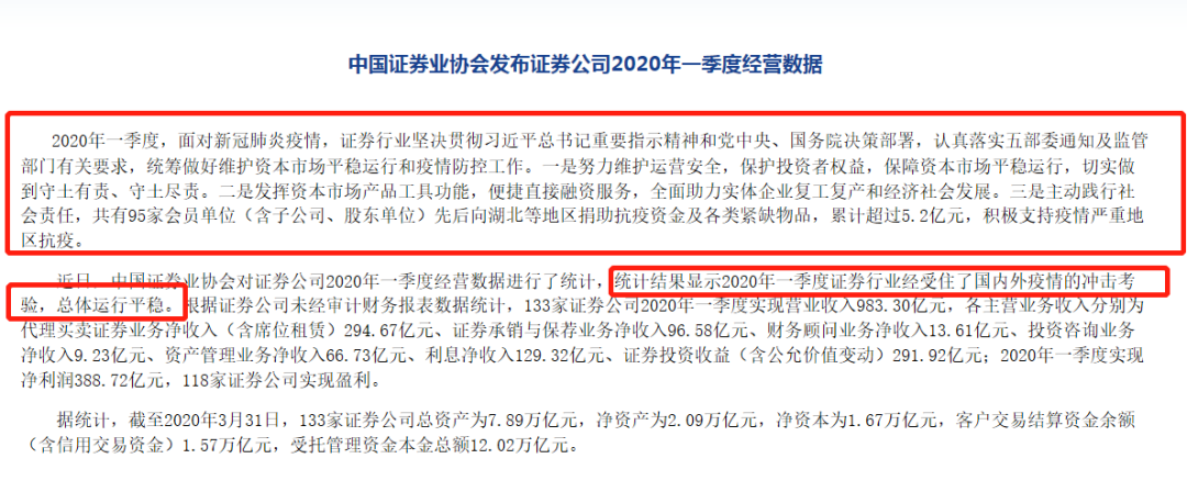 证券业协会于日前发布了《证券公司2020年一季度经营数据》,时间较往年稍早一些。虽然,133家证券公司一季度整体净利润同比下滑一成,且有15家出现亏损(去年同期12家亏损)。但是,证券业协会罕见地用大段文字对全行业在维护资本市场平稳运行和疫情防控工作中的努力进行肯定。如此共克时艰之际,显得颇为温情。