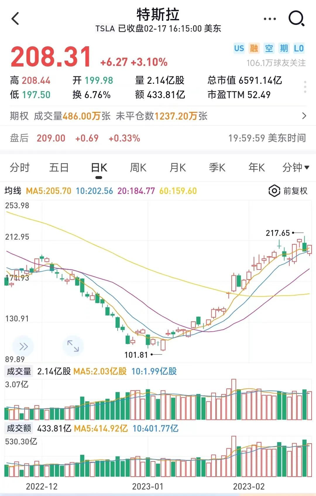 特斯拉今年以来的连续大涨,也让去年四季度抄底的一些大佬赚得盆满钵满,其中就包括“木头姐”凯西·伍德。特斯拉股价大涨,与其中国市场车型的大幅降价密不可分。马斯克在2022年第四季度和全年财报电话会议上表示,在特斯拉降价后,订单量在2023年1月达到历史新高,几乎是工厂产能的两倍。随着特斯拉股票的暴涨,特斯拉首席执行官埃隆·马斯克或有望重新夺回“世界首富”的宝座。根据最新的彭博亿万富翁指数,马斯克的身价为1870亿美元,较第一名路易威登集团董事长伯纳德·阿诺特的1900亿美元,仅差30亿美元。然而,近日美国投行BTIG的一项技术分析指出,特斯拉在今年开局的强势表现将会迎来考验。该行的首席市场技术分析师Jonathan Krinsky表示,特斯拉自1月6日以来的涨势令最乐观的预测者感到惊讶,这同样也是他没有预见的,但是,这一令人惊讶的涨势将开始考验技术指标。该分析师认为,特斯拉的“涨势已基本结束”,之后将降温。