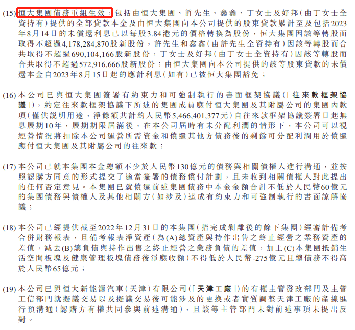 第二步,2023年8月,许家印带头推进恒大汽车的债转股化债方案。彼时恒大汽车对中国恒大、许家印夫妇等关联企业的欠款,高达208.9亿港元。