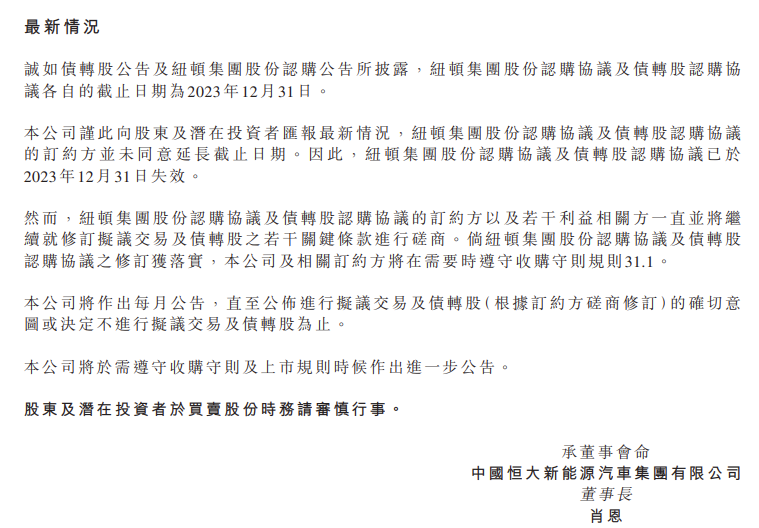 1月1日,恒大汽车公告,自己跟纽顿集团的股份认购协议到期失效,恒大汽车将无法再获得纽顿集团的战投资金。