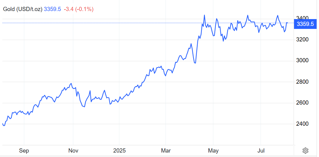 周一,黄金现货价格小幅下跌至每盎司3350美元附近,主要因一些散户投资者在周五金价创下两个月来最大涨幅后获利了结,当时主要受疲软非农带来的强劲避险需求和降息预期升温的推动。另一逻辑在于,上周美国总统特朗普宣布对数十个国家的进口商品征收新的关税,税率从10%到41%不等,并将于8月7日生效,此举再次引发全球贸易紧张局势。