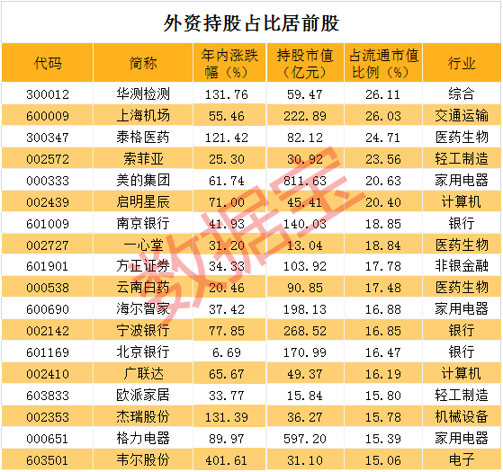 证券时报·数据宝统计显示,外资持股占比超过20%的股票,共有5只。华测检测排名第一,排名第二的上海机场,持股比例达26.03%。排名第三是泰格医药,持股比例达24.7%。