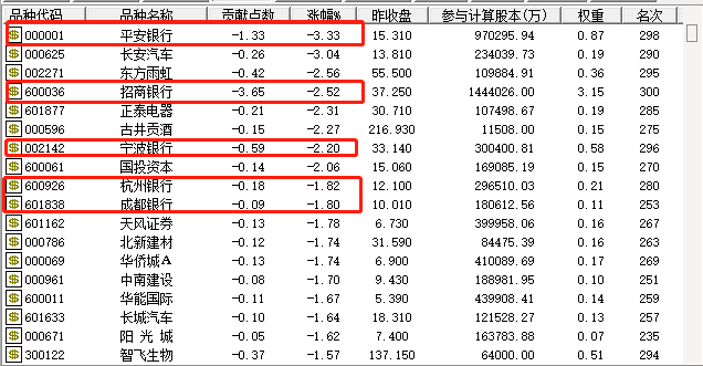 A股银行股中,则是平安银行跌幅最大,达3.33%,其次是招商银行、宁波银行和常熟银行,但银行股整体的跌幅对大盘构成了较大的拖累。
