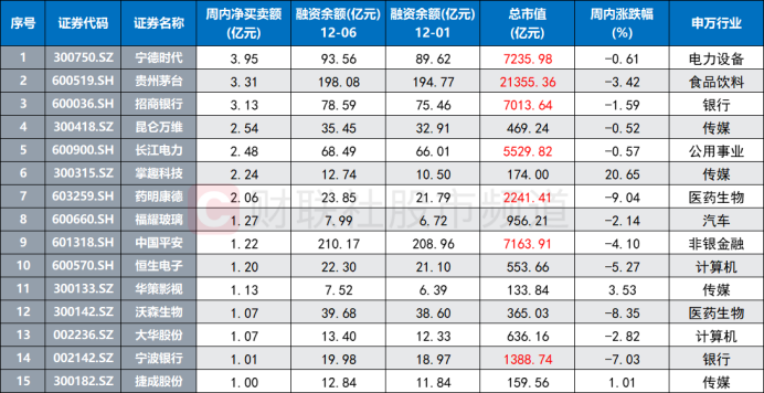 具体个股来看,截至12月6日,以周内融资数据统计,累计共有15只个股获融资资金加仓超1亿元。其中,宁德时代、贵州茅台、招商银行周内净买额分别达3.95亿元、3.31亿元、3.13亿元,值得注意的是,宁德时代本周3个交易日期间每日均有超1亿元杠杆资金加仓。此外,昆仑万维、长江电力、掌趣科技、药明康德、福耀玻璃等股周内也获融资客重点关注。
