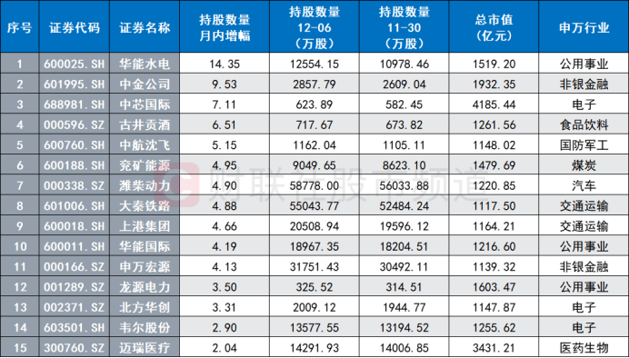 注:本月北向资金持股量增幅居前的超千亿元股(截至12月7日收盘)