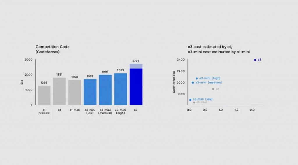 在衡量编程能力的Codeforces Elo评分中,o3取得了2727的Elo评分,而o1评分仅为1891。事实上,o3 mini在中等推理时间模式的表现也已足以超越o1。