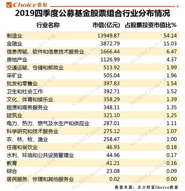 在股票资产中,四季度基金投资占比最高的依然是制造业,持仓市值达到13949.87亿元,占股票投资市值比例的54.14%。其次为金融行业,市值为3872.79亿元。