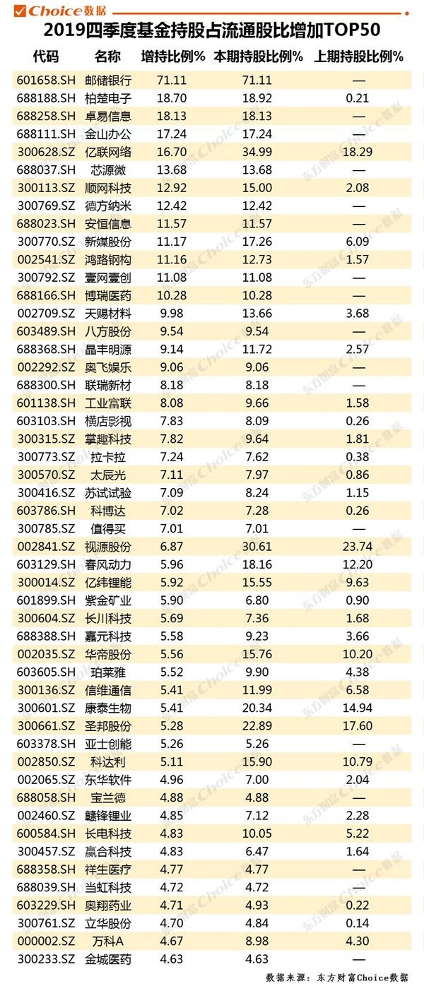 增持比例排名第一的是邮储银行,四季度最新增持比例占流通股71.11%(其流通股本为29.74亿,总股本870亿);柏楚电子排名第二,最新持股比例18.92%,增长18.70%;排名第三的是卓易信息,最新增持18.13%。