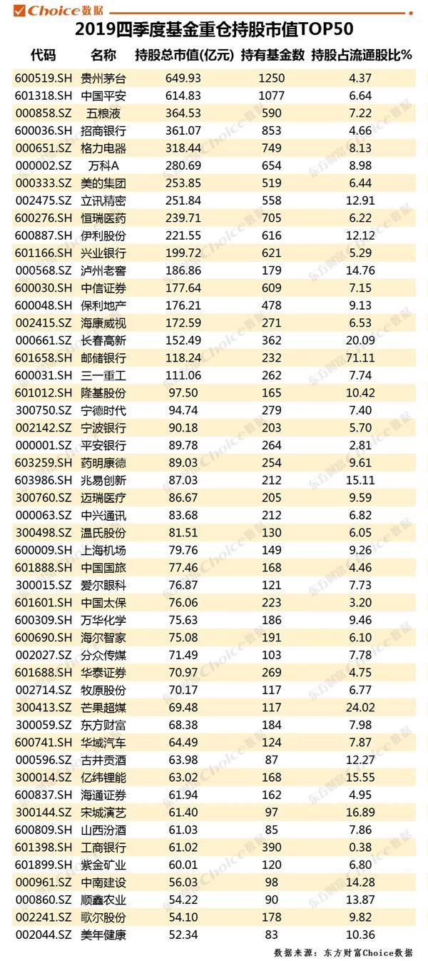 从个股来看,贵州茅台、中国平安和五粮液在四季度被抛售,持有基金数分别为1250、1077和590只。贵州茅台持仓市值最高,达到649.93亿元。