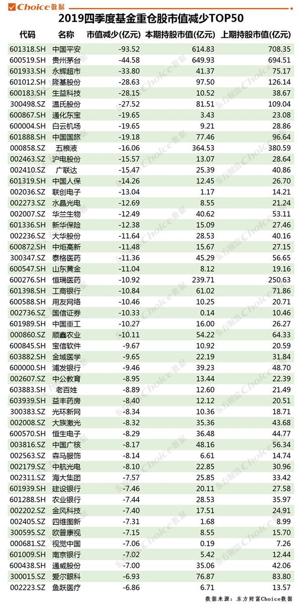 四季度基金重仓股中被公募基金减持最多的是中国平安,市值减少93.52亿元。贵州茅台次之,市值减少44.58亿元。