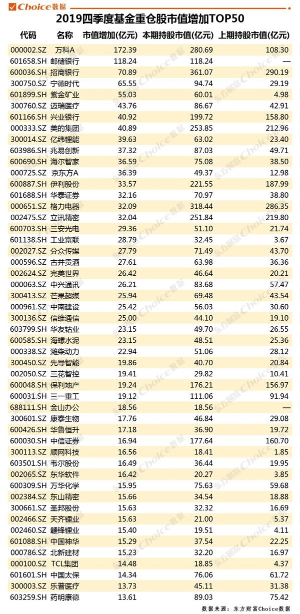 四季度,公募基金重仓股中,万科A持仓市值增加排名第一,达172.39亿元。排在第二的是邮储银行,增仓市值118.24亿元。招商银行以70.89亿元的市值增长排名第三。市值增加过50亿的还有宁德时代和紫金矿业。