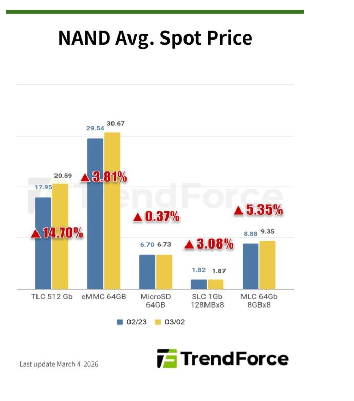 更重要的是,价格上涨还没有结束。DigiTimes的产业链消息称,2026年Q2 DRAM价格可能再涨约70%;与此同时,Phison(群联电子)已开始与客户讨论预付款安排,因为NAND价格继续飙升、供应仍然紧张。这类“先付款、后锁货”的交易结构,本质上说明市场已经从常规采购模式切换到“先抢资源”的卖方市场。Tom’s Hardware对这轮存储超级周期的总结更直白:DRAM价格波动甚至开始呈现“按小时变化”的特征。