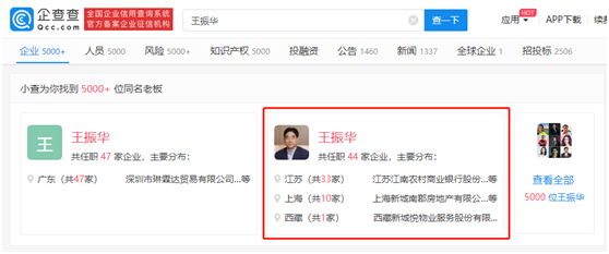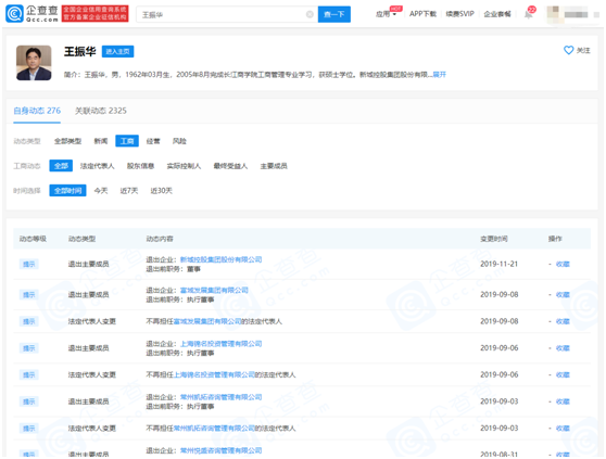 企查查显示,王振华共涉及44家公司,自2019年6月29日起共退出22家公司,其中包含新城控股集团股份有限公司、富域发展集团有限公司、上海锦名投资管理有限公司、上海橙贝信息技术有限公司、上海星轶影院管理有限公司等。