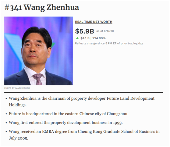 而根据最新的福布斯实时富豪榜,王振华以59亿美元的身家位列第341位。