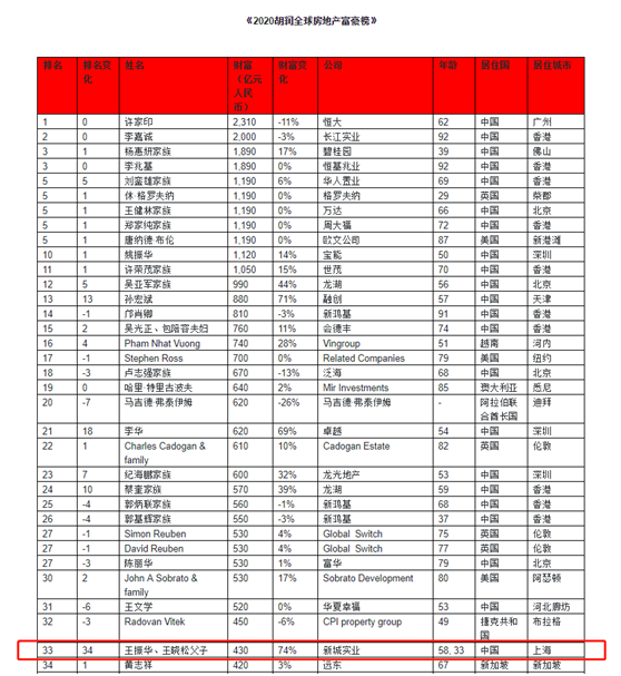 在今年3月发布的《2020胡润全球房地产富豪榜》中,王振华和其子王晓松在胡润全球房地产富豪榜中位列第33名,相比去年上升34名;身价430亿元,相比去年财富增长74%。