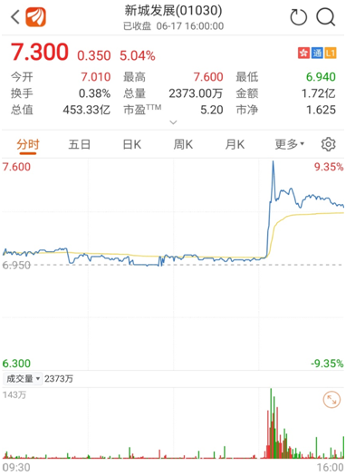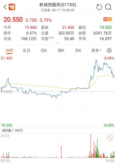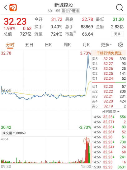 消息公布后,新城控股股价尾盘出现拉升,一度上涨3.73%,截至收盘,新城控股股价报收32.23元/股,上涨1.99%,总市值为727亿元。港股新城发展盘中一度大涨逾9%,截至收盘涨超5%,总市值达453亿港元;新城系新城悦服务盘中一度大涨逾8%,截至收盘上涨近4%,总市值达168亿港元。