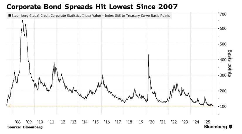 然而,随着企业发债规模,尤其是甲骨文、微软以及Meta这样的科技公司发债规模愈发庞大且可能创历史纪录,可能推动信用利差大幅走阔。这一乐观且火热的市场构成了一种悖论。资金管理者们不希望错过公司债配置机遇,但他们也必须接受在面临日益增加的潜在风险(比如不可预测的美国财政与关税政策、地缘政治紧张局势以及甲骨文等AI算力产业链领军者创纪录发债、愈发庞大债务压力引发的企业突然倒闭)背景之下,获得的潜在回报以及风险补偿已经变得更少。