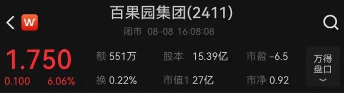 7月7日百果园集团股价一度涨超20%,当天收涨13.73%。不过,之后百果园集团股价震荡下行,截至8月8日收盘,该股报1.75港元/股,总市值为26.94亿港元。