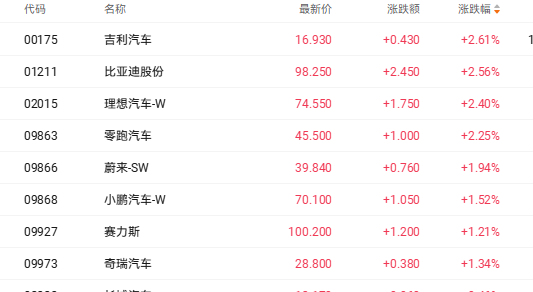 受益于市场多重利好,港股汽车股多数上涨。截至发稿,吉利汽车(00175.HK)涨2.61%、比亚迪股份(01211.HK)涨2.56%、理想汽车-W(02015.HK)涨2.40%、零跑汽车(09863.HK)涨2.25%、蔚来-SW(09866.HK)涨1.94%。