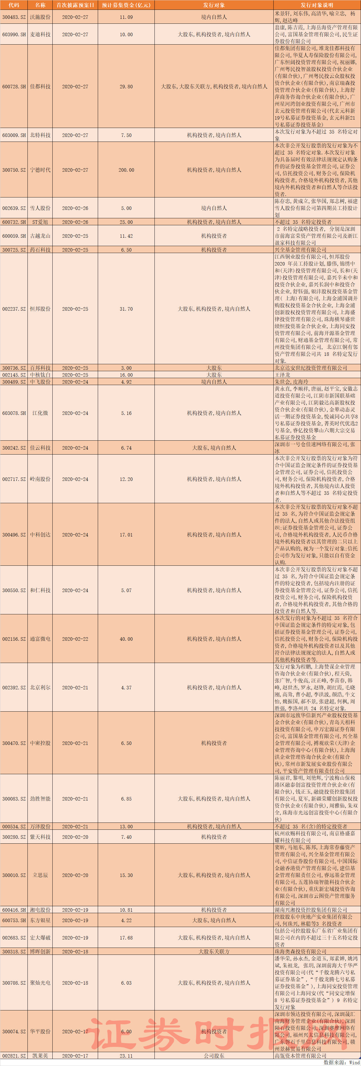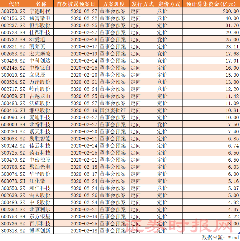 据Wind统计,2020年2月14日,证监会发布再融资新政后,已经有31家上市公司发布新的融资方案,其中,宁德时代拟募资200亿元,是目前通过定增募资金额最多的公司。