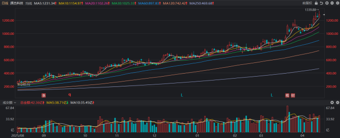 作为近期刚成为“千元股”的市场人气标的,源杰科技的股价动向一直受投资者关注。在短暂横盘震荡2周后,源杰科技自4月10日起再度开始涨势,截至今日收盘,其近4个交易日累计上涨近14.0%。目前,源杰科技的总市值规模已迈入“千亿俱乐部”序列,年内市值累计增长553.5亿元,在全市场A股中位居第6位。