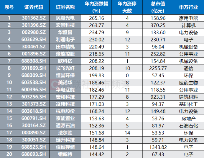 此外,若以市值层面统计,千亿市值股共有6只,分别为长飞光纤、招商轮船、佰维存储、亨通光电、德明利、源杰科技。其中,长飞光纤唯一总市值在2000亿元以上,年内涨幅也在2.08倍,同时,其年内累计涨停10次。其余个股方面,剔除ST股,法尔胜、江顺科技、汉缆股份、锋龙股份、金牛化工、杭电股份年内涨停次数也居前。