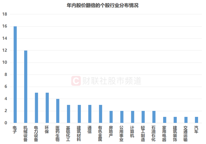 从行业分布(申万一级)上看,年内股价翻倍的个股中,电子、机械设备股数量明显较多,分别占比近23.5%、17.6%,电力设备、环保、医药生物、基础化工、建筑材料、通信、有色金属股数量也相对居前。细分板块(申万三级)方面,分立器件、印制电路板、金属制品、其他自动化设备、数字芯片设计、通信线缆及配套、消费电子零部件及组装股相对较多。