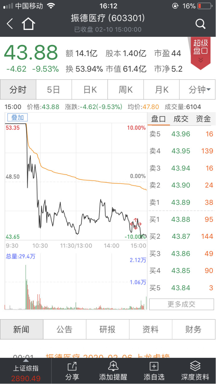 在连封6个涨停板之后,今日开盘振德医疗再封涨停板,但在半小时后突然跳水,之后股价一路震荡下行,到收盘时已经近乎跌停,收于43.88元/股,跌幅达9.53%,换手率达53.94%,主力资金净流出2.23亿元。