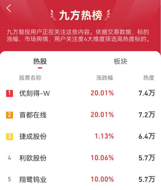 九方热榜:优刻得-W,首都在线,捷成股份,利欧股份,翔鹭钨业