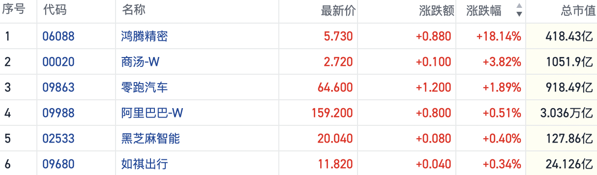 截至发稿,鸿腾精密(06088.HK)涨超18%,商汤-W(00020.HK)涨近4%,黑芝麻智能(02533.HK)、零跑汽车(09863.HK)等个股也纷纷跟涨。