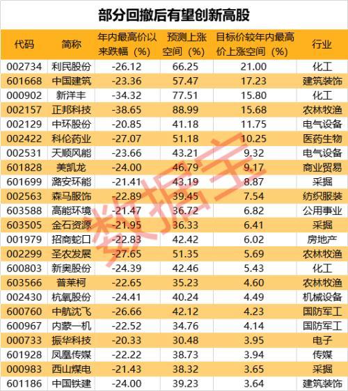 此外,新洋丰、正邦科技、中环股份、科伦药业机构预测目标价较年内最高价上涨空间也较大,均超过10%。