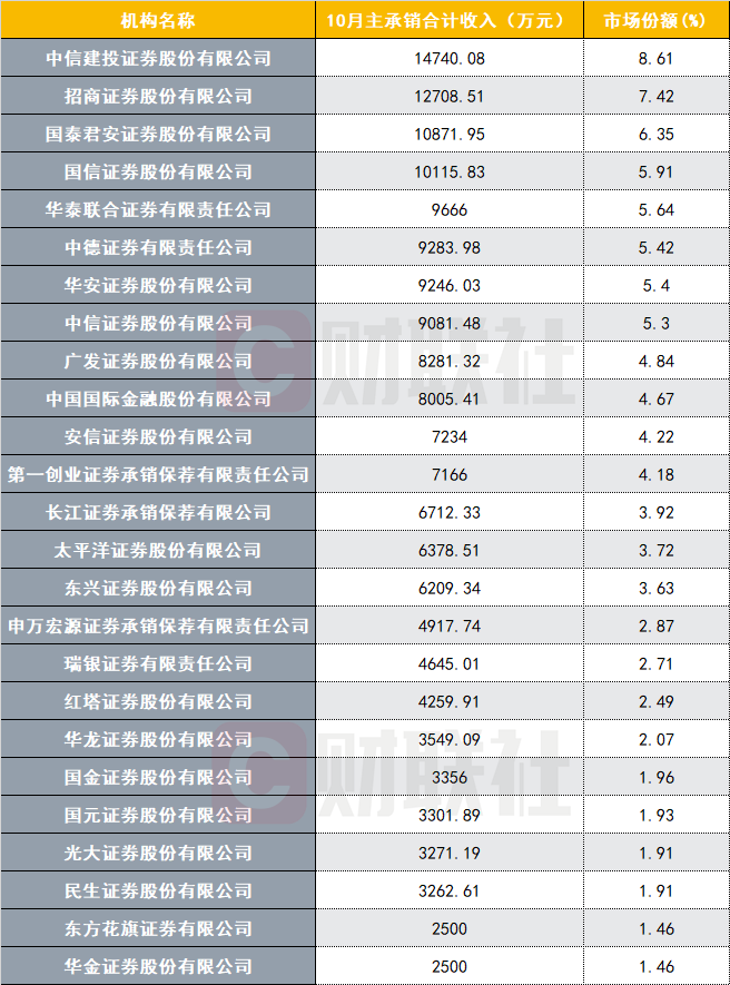 具体来看,10月共4家主承销收入过亿,分别是中信建投(1.47亿)、招商证券(1.27亿)、国泰君安(1.09亿)和国信证券(1.01亿),市场份额分别为8.61%、7.42%、6.35%和5.91%。