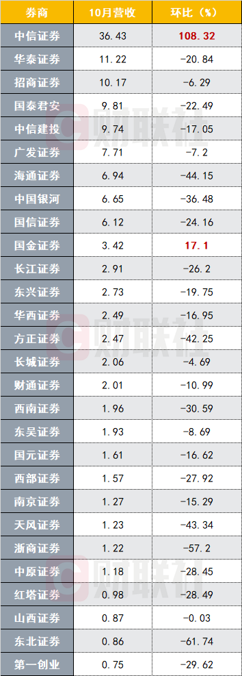 券商10月业绩熄火 仅2家营收环比增长