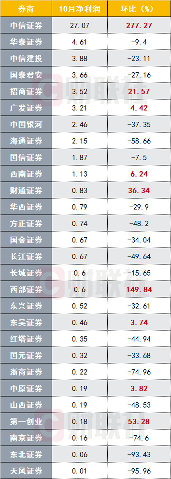 截至11月6日晚20时30分,共有30家上市券商发布10月财务数据。
