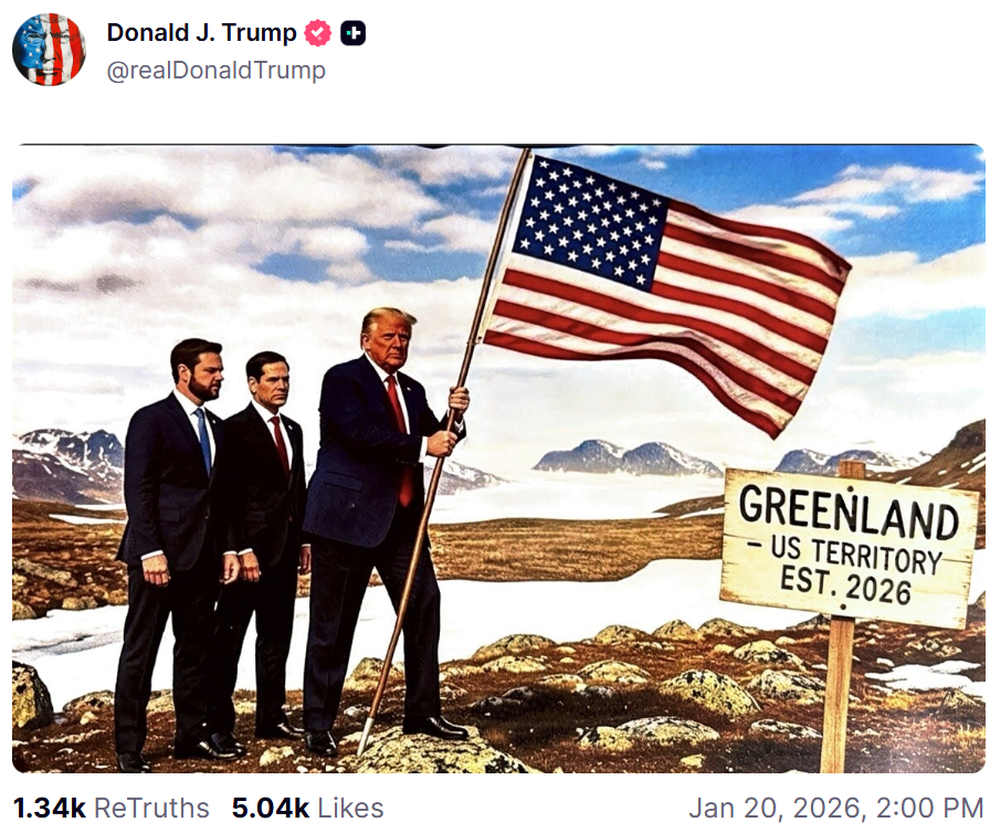 在其中一张图片中,特朗普手执美国国旗登上格陵兰岛,身后跟着美国副总统万斯和国务卿卢比奥,旁边指示牌上写着“格陵兰岛2026年成为美国领土”。