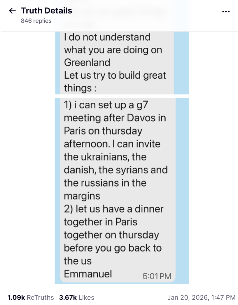 根据特朗普发布的截图显示,法国总统对他试图控制格陵兰岛的行为感到困惑,提议周四在巴黎举办一场紧急G7峰会。他还邀请美国总统共进晚餐。