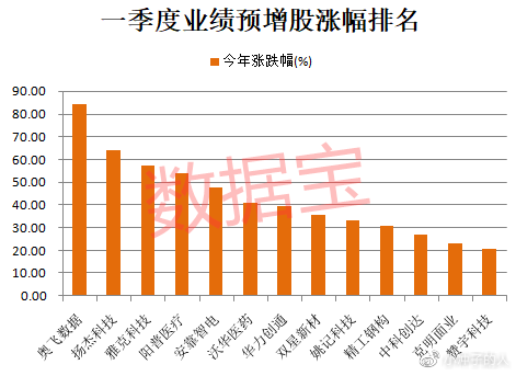 奥飞数据表现最为抢眼,该股今年以来累计上涨84.12%。奥飞数据是专业的数据中心业务运营商和通信综合运营企业。公司预计今年一季度净利润为0.7亿元至0.73亿元,同比增长393.92%至413.59%,业绩大增主要与公司持股的科创板企业紫晶存储公允价值确认的投资收益较大有关。扬杰科技、雅克科技、阳普医疗、安靠智电、沃华医药等累计涨幅均在30%以上。