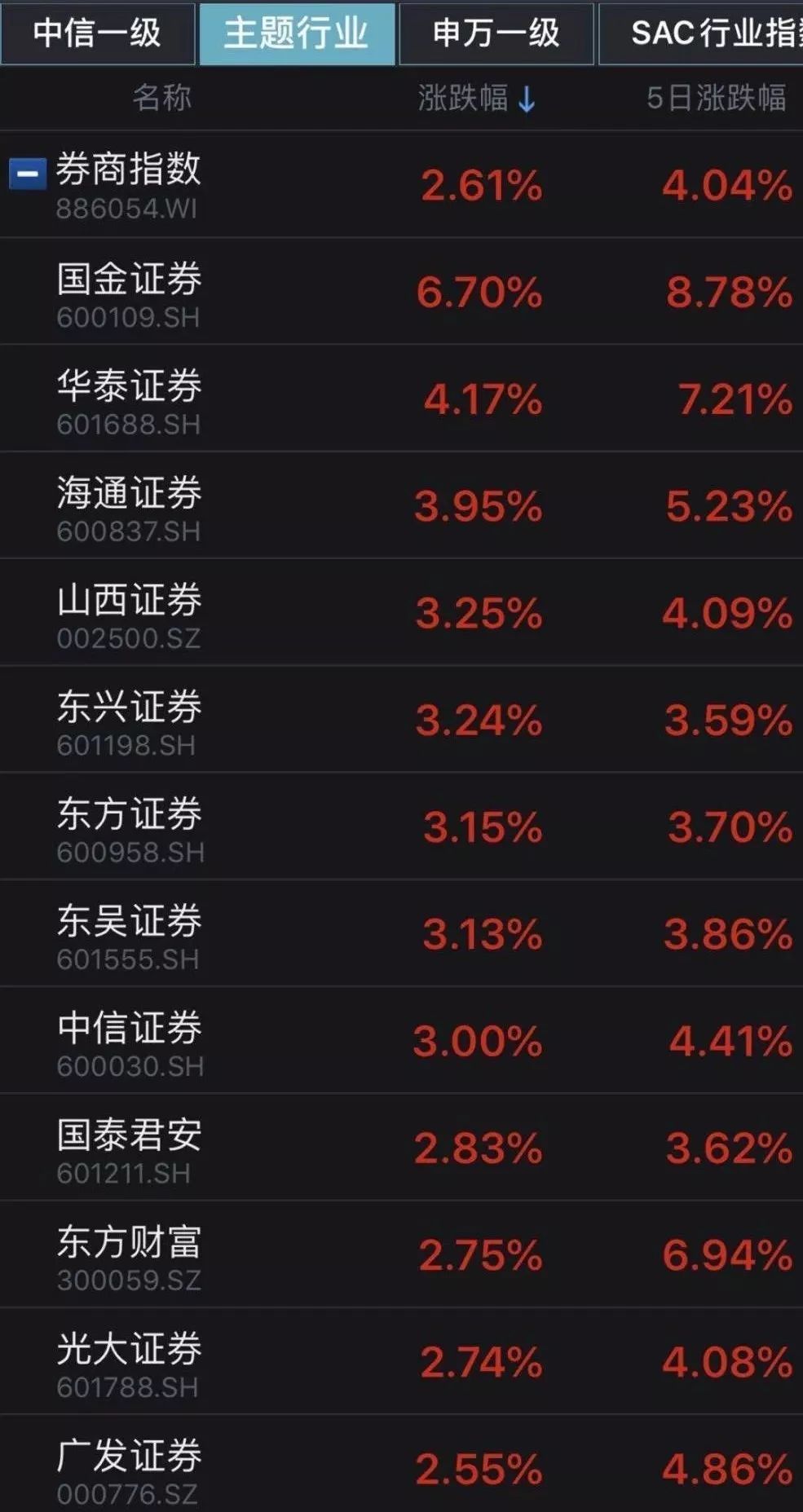 一方面,再融资新规落地的直接受益方便是券商板块,而盘面上券商板块也是高开逾2%。截至午间收盘,Wind券商指数上涨2.61%,板块内国金证券上涨6.70%,华泰证券上涨4.17%,海通证券、山西证券、东方证券等涨逾3%。