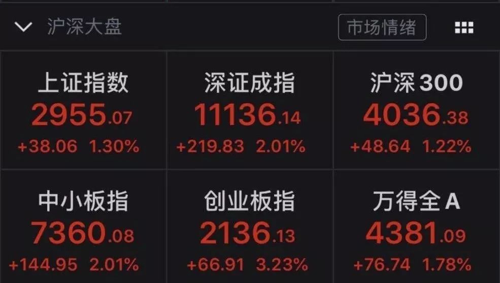 2月17日,在再融资新规落地和MLF“降息”的刺激下,两市高开高走,创业板市场走势强于主板市场。截至午间收盘,三大指数悉数上涨,上证指数上涨1.30%至2955.07点,深证成指上涨2.01%至11136.14点,创业板指上涨3.23%,报2135.40点,创2016年12月以来新高。