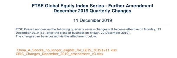 本次调整纳入7只A股股票、剔除73只股票,富时罗素公告显示,本次调整是基于沪港通、深港通中陆股通的名单调整。同时,在12月富时罗素的例行调整中并没有改变A股的纳入因子,目前A股纳入因子为15%。