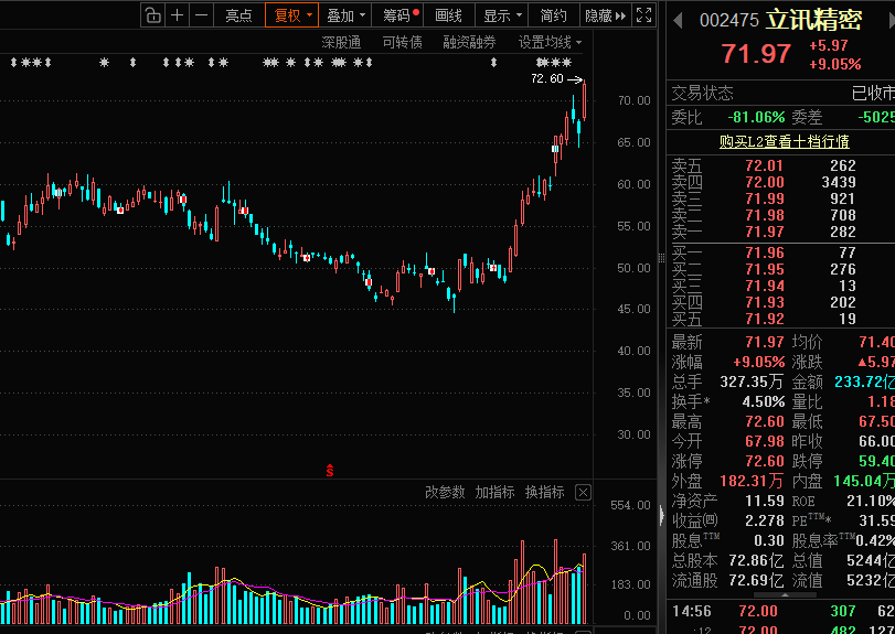受此消息影响,立讯精密4月27日盘中一度涨停,收盘上涨9.05%。4月以来,立讯精密已累计上涨46.1%。公司此前发布年报显示,实现归母净利润166亿元,同比增长24.2%。