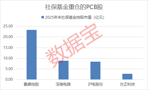 社保基金偏好规模优势突出、确定性强的龙头企业,重仓多家行业头部大市值公司。鹏鼎控股、深南电路、沪电股份、方正科技2025年末获社保基金重仓,最新市值均在500亿元以上。