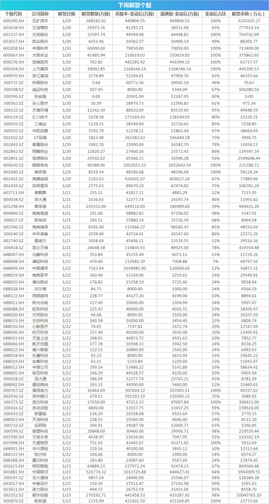 此外,近期,首批上市的25家科创板公司陆续发布公告称,首次公开发行网下配售限售股将于1月22日上市流通。